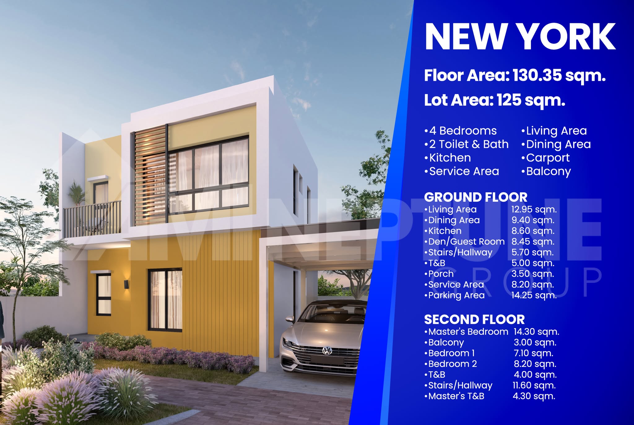 Est.: ₱10,225,000.00 View Additional Details New York Lot Area 125 sqm Floor Area 130.35 sqm 4 Beds 2 Bath Brgy. Sanja Mayor Tanza, Cavite