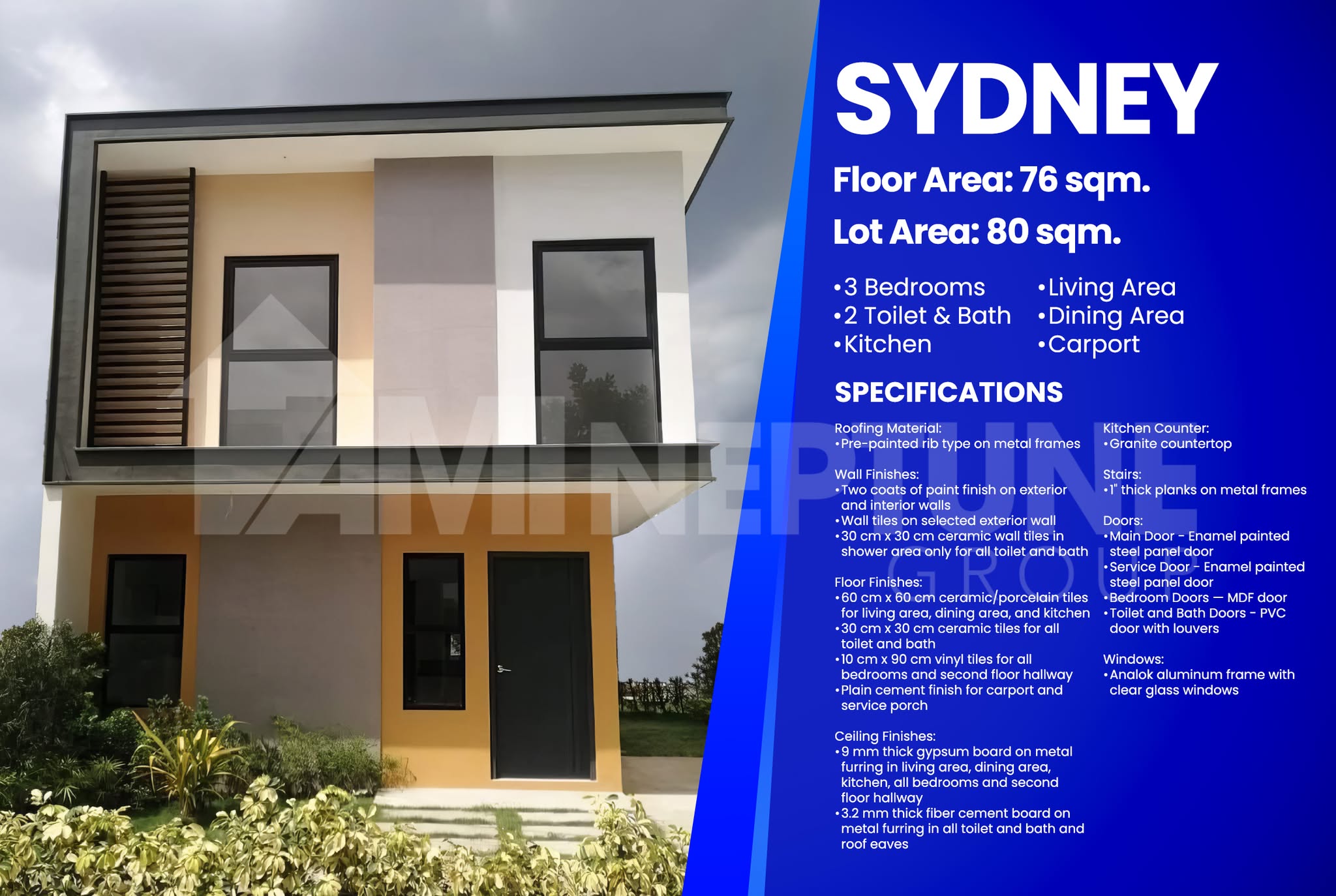 Est.: ₱6,120,200.00 View Additional Details Sydney Lot Area 87 sqm Floor Area 76.09 sqm 3 Beds 2 Bath Brgy. Sanja Mayor Tanza, Cavite